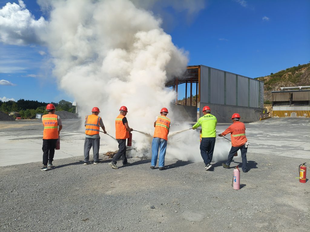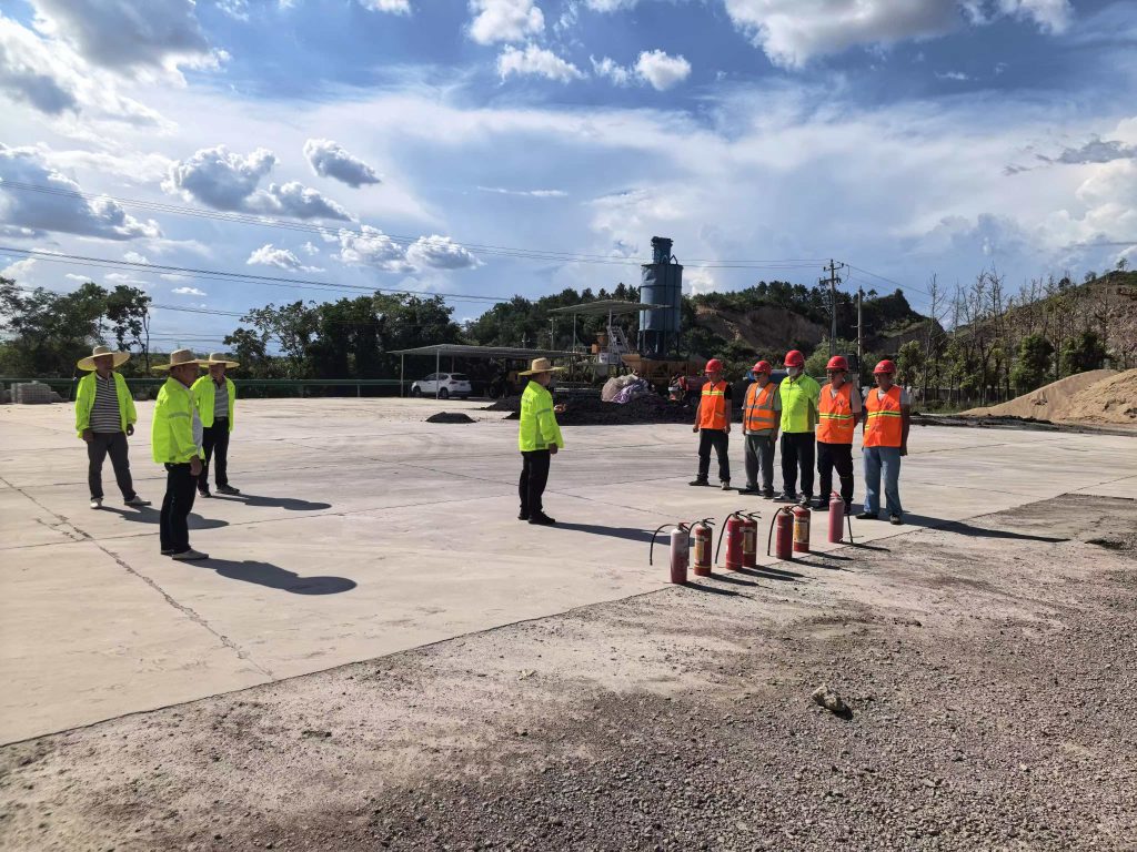 演练模拟了拌合站原料堆放区因高温引发火情的场景。发现“火情”后,现场人员立即按流程上报,应急小组迅速响应,分工明确,警戒组划定安全区域,疏散组引导员工有序撤离,灭火组利用灭火器对“火源”进行扑救。整个过程紧张有序,各环节衔接顺畅,员工们熟练掌握了灭火器材的操作要领,灭火动作迅速规范。