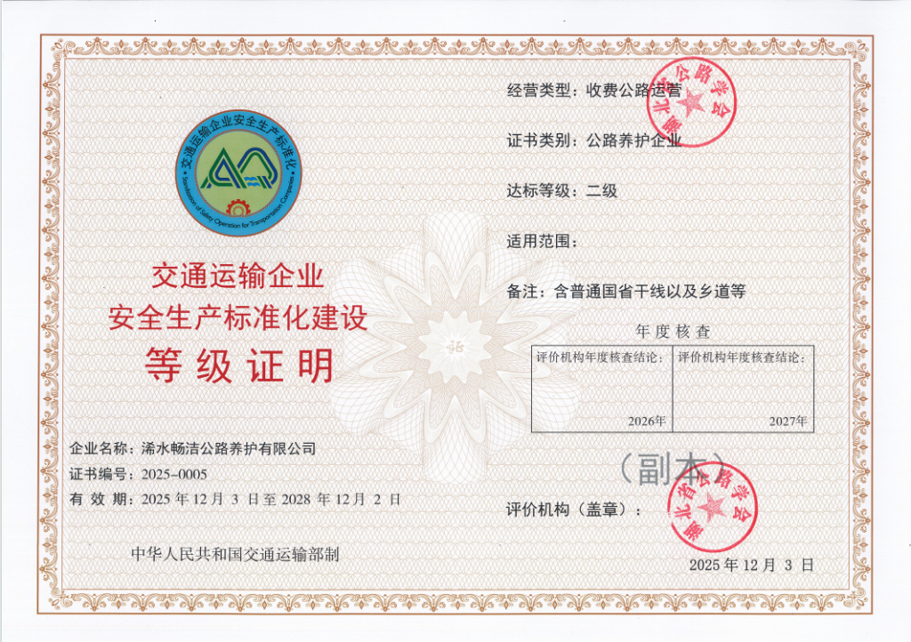此次荣获安全生产标准化达标证书,既是公司三年攻坚行动的“成绩单”,更是持续深化安全管理的“新起点”。未来,畅洁公路养护公司将以此次达标为契机,进一步巩固三年攻坚成果,持续优化安全生产标准化体系,把安全理念融入路基修护、路面摊铺、桥梁养护等每一个环节,以更严标准、更实举措守护公路通行安全,为服务地方交通事业高质量发展筑牢坚实的安全屏障。