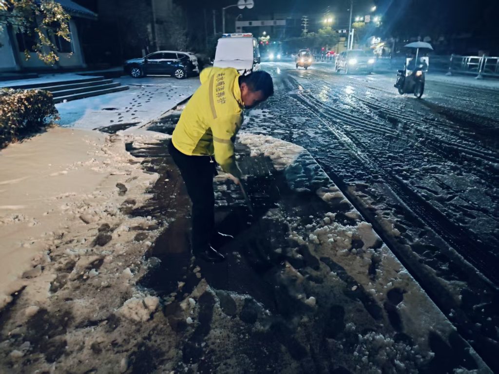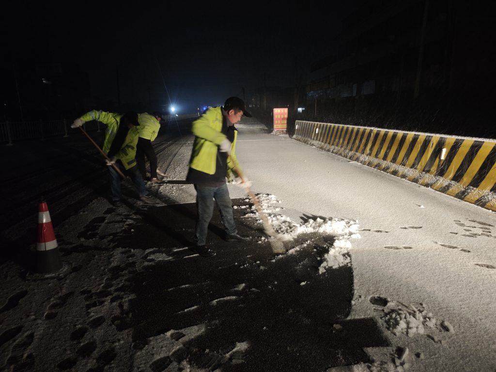 天已亮,雪未停。浠水新大桥、宝塔大桥上……,各应急分队已开始作业。机械轰鸣,融雪剂撒落。桥梁、弯道、陡坡路段,身影忙碌。雪落在他们肩上,很快凝成薄霜;呵气成雾,却掩不住专注的神情。